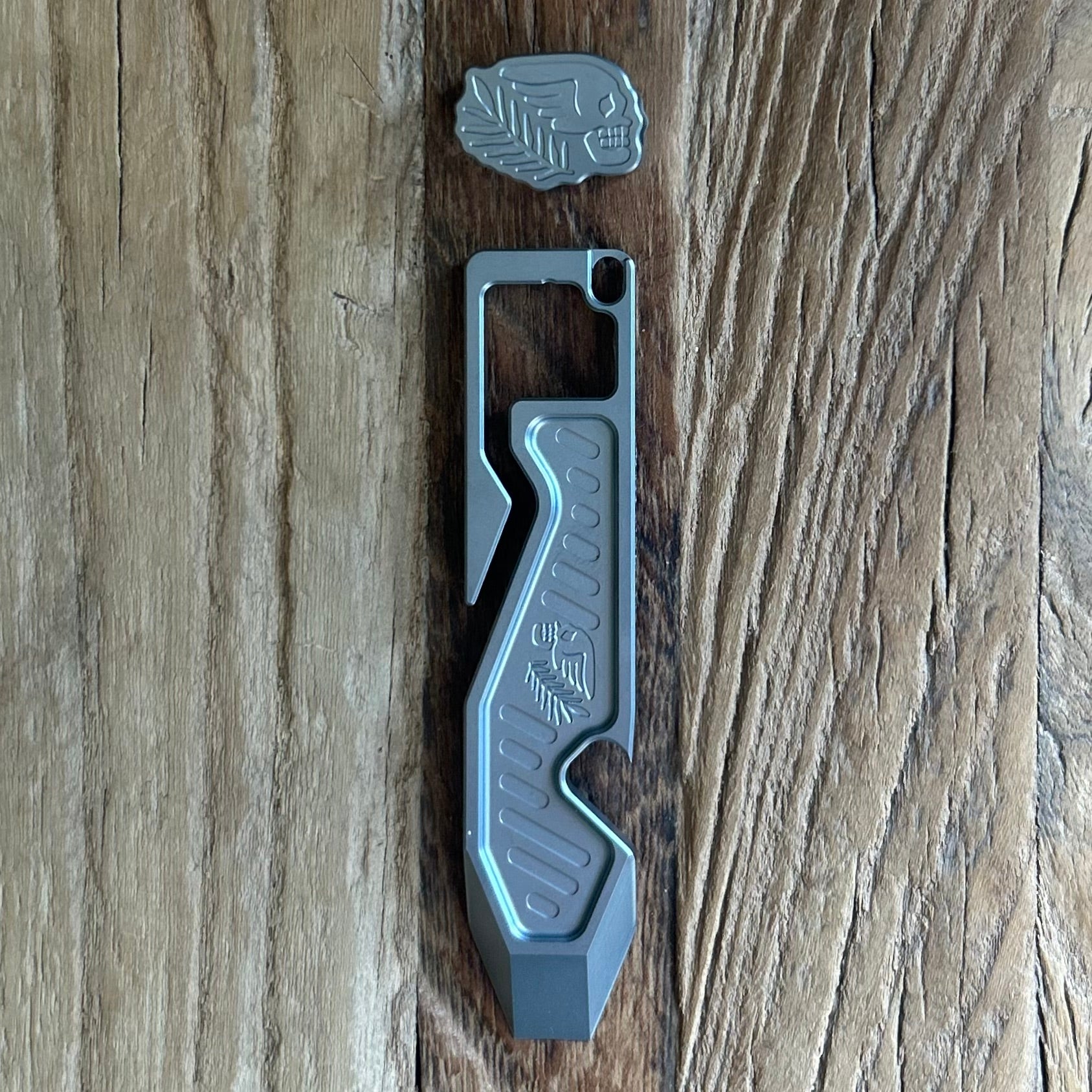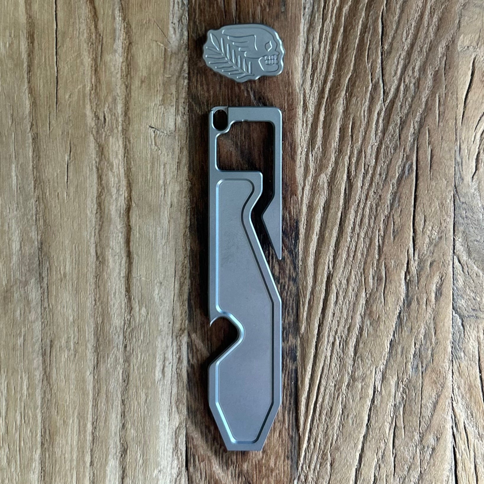 The ESPION 5th pocket pry tool is pure class. Measuring 3 1/2 inches, this compact and functional titanium tool will meet all your prying needs and look good doing it. Paired with a Titanium "BONE and BRANCH" bead. Proudly manufactured in the USA by GRIFFWORX.